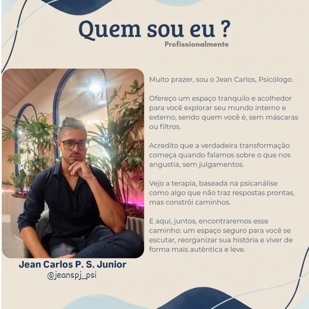 Olá! Sou Jean Carlos, psicólogo clínico, e meu propósito é oferecer um atendimento humanizado, que se torne um espaço de escuta segura e sem julgamentos. Assim, você terá a liberdade de deixar as máscaras de lado, cuidar da sua mente e ser quem deseja ser